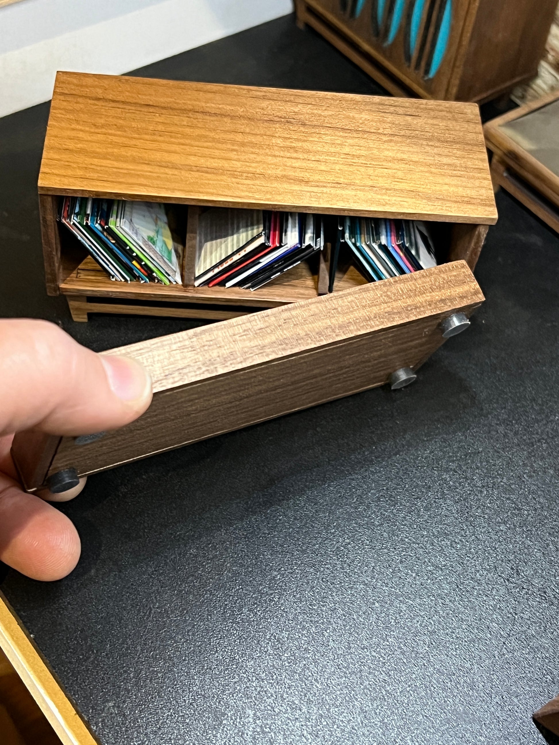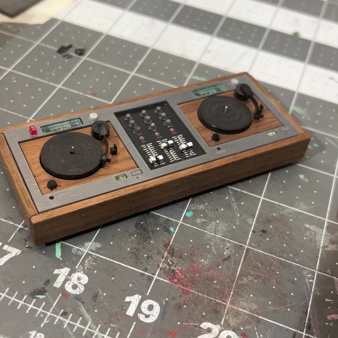 Choose which components you want from the options. This deejay mixing board is made of walnut, acrylic, and paint, has rotating turntable arms and sliding faders. It can be purchased with or without our walnut console. Choose the album add-on and receive thirty titles including ACDC, BeeGees, Blondie, Bowie, the Clash, Aretha Franklin, Marvin Gaye, Missing Persons, Pink Floyd, Prince, Talking Heads, and more. Albums DO NOT have vinyl inside them and do not open.